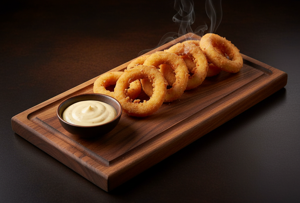 Луковые кольца — это хрустящая закуска, которая отлично подходит к любому напитку. Обжаренные до золотистой корочки. Отличный выбор для дружеских встреч или просмотра любимых матчей. Попробуйте и наслаждайтесь!