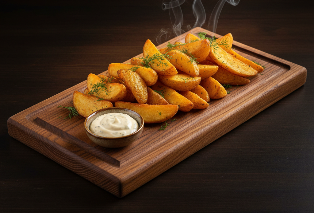 Погрузитесь в мир вкуса с нашими хрустящими картофельными дольками Айдахо, приготовленными до золотистой корочки и жаренными с ароматным чесноком и зеленью. Это блюдо станет отличным дополнением к вашим любимым напиткам в нашем баре. Позвольте себе насладиться сочетанием простоты и вкуса, которое не оставит равнодушным!