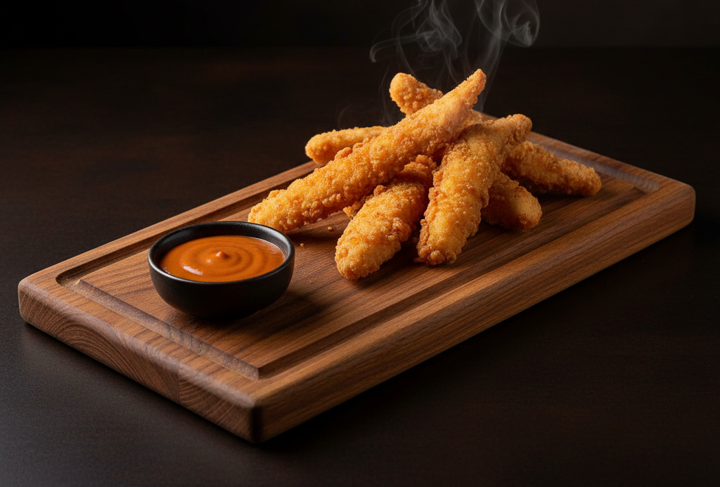 Хрустящие куриные стрипсы, обжаренные до золотистой корочки. Нежная курочка внутри и ароматный соус создают идеальное сочетание для истинных ценителей закусок
