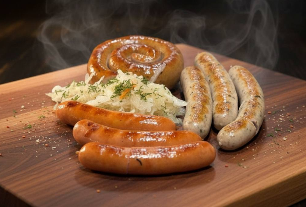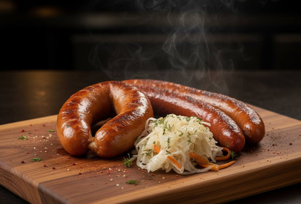 Венские колбаски — отличный выбор для сытного обеда или ужина! В составе колбасок — говядина и свинина, а также сыр, который придаёт вкусу особую изюминку. Подаются с квашеной капустой, которая дополняет блюдо. Попробуйте венские колбаски в качестве горячей закуски!