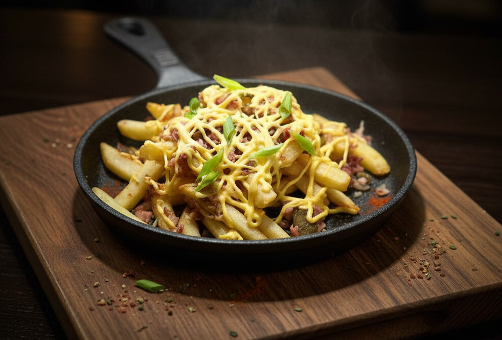 Ищете, чем утолить голод? В качестве горячей закуски мы предлагаем вам попробовать наше новое блюдо. Нежный сырный соус, золотистое хрустящее фри, ароматный бекон с луком, а также пикантные хрустящие маринованные огурчики – всё это вместе создаёт неповторимую гармонию вкусов